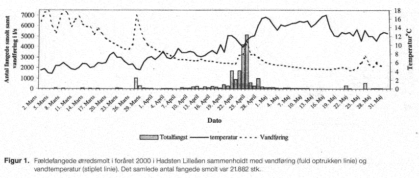 Stigninger i vandføring og/eller temperatur har også i en lang række andre undersøgelser vist sig at være de to vigtigste faktorer, der bestemmer, hvornår på foråret smoltene trækker Om det er vandtemperaturen eller vandføringen, der får den største del af smoltene til at trække, afhænger altså af forholdene i det enkelte forår. Ved tidligere undersøgelser i Gudenåsystemet har vi ofte observeret et stort udtræk hen i maj, men dette så vi ikke i Lilleåen i foråret 2000, sandsynligvis på grund af de høje vandtemperaturer ( 14-16,5 grader C) åen kom op på de første 3 uger af maj. Generelt begynder smolt at afsmoltificere ved temperaturer over 14 grader og mister dermed deres vandringslyst.