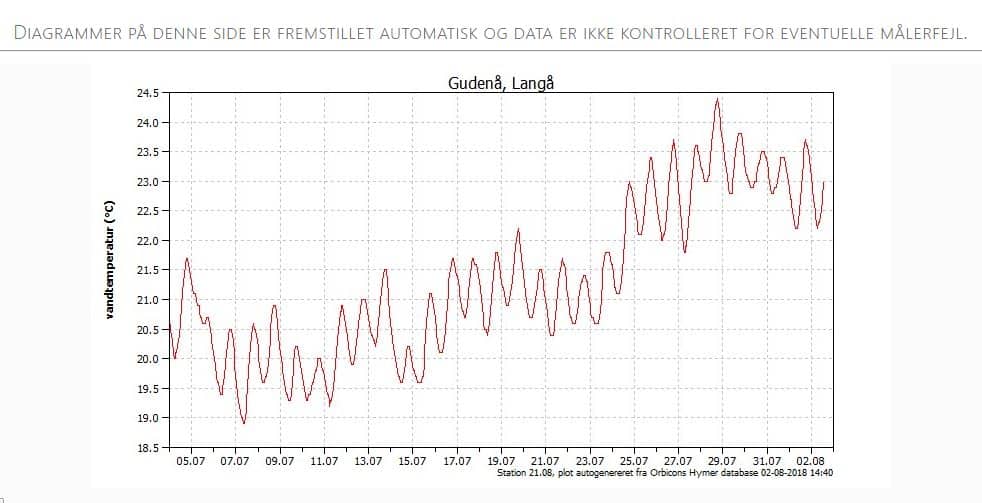 Det se imidlertid helt anderledes ud for Gudenåen, hvor temperaturen har været over 24 grader, målt ved Amtmands Hoppes Bro, eller rettere over den temperatur hvor laksefisk ikke kan overleve. Det er helt forfærdeligt og en sand naturkatastrofe. Vi kan kun støtte alle bestræbelser på at mindske katastrofen og give vores fiskevenner langs Gudenåen al den hjælp og støtte vi formår.
