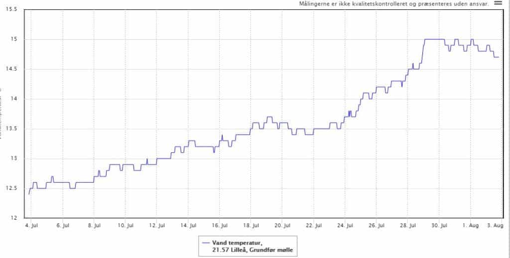 Fortsætter tørken og de ekstreme temperaturer, må vi tage sagen op til revision. Jeg vil gerne underbygge den foreløbige beslutning med lidt tal. Hvis I ser på temperaturgraferne over Lilleaaen, målt ved Grundfør Mølle, vil I se at temperaturen ikke har været over 15 grader. Der er rigeligt varmet men endnu ikke kritisk for laskefisk.