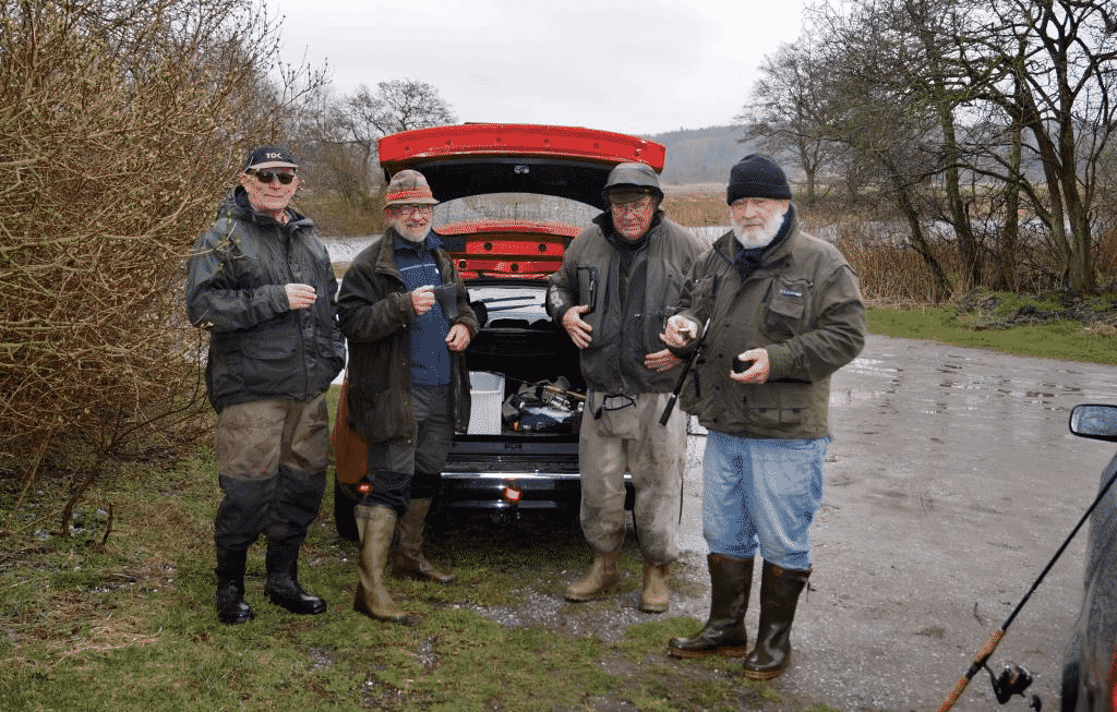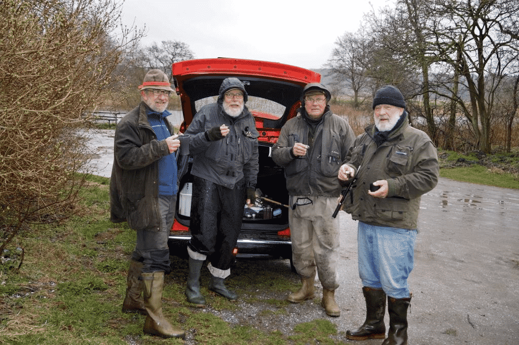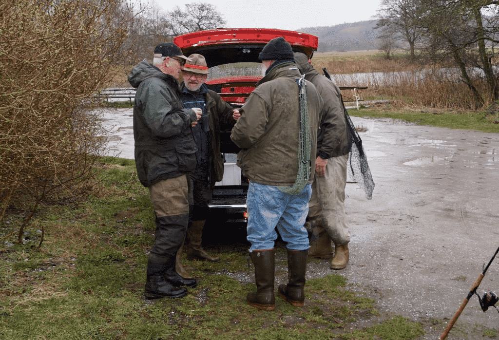 Vi gik i gang med spinnestængerne, åen var usædvanlig høj, kold og grå, og efter en times tid med tænderklapren og meget kolde fingre, trods halvvanter m.m. blev vi enige om at nu måtte det være kaffetid. Efter indtagelse af kaffe og en dram, blev vi enige om at nu havde vi da været der, så vi tog afsked med ungersvendene og hinanden, med ønsket om Knæk og Bræk og en god Påske.